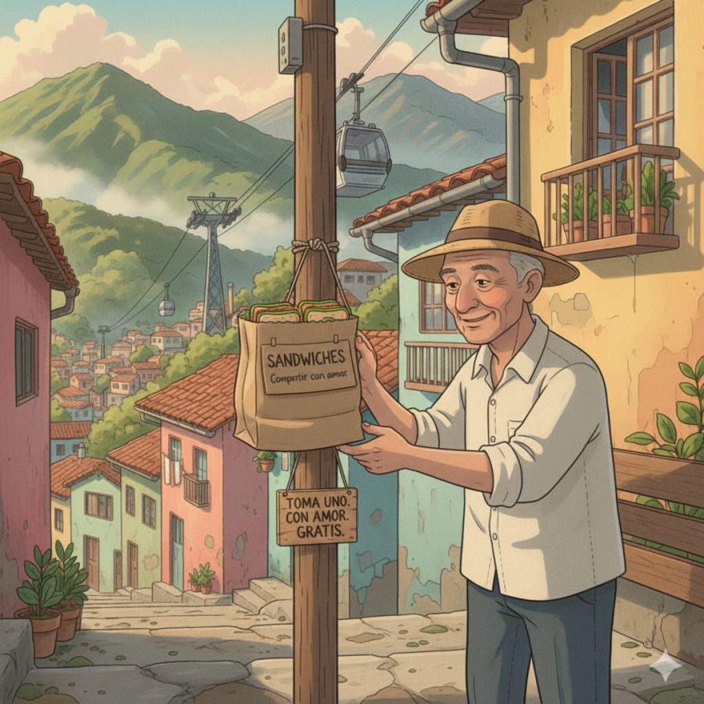 En Medellín, Colombia, hay una esquina en el barrio Manrique, donde todos los días aparecen sándwiches. A las 3 AM. Exacto. Envueltos en papel aluminio. En una bolsa plástica colgando de un poste. Nadie sabía quién los dejaba. Los habitantes de calle del sector los esperaban. Si llegabas a las 3:15 am, ya no había nada. Esto pasó todos los días durante 6 años. De 2016 a 2022. Sin fallar. Ni un solo día.