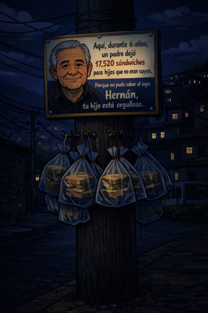 «Aquí, durante 6 años, un padre dejó 17,520 sándwiches para hijos que no eran suyos. Porque no pudo salvar al suyo. Hernán, tu hijo está orgulloso.»